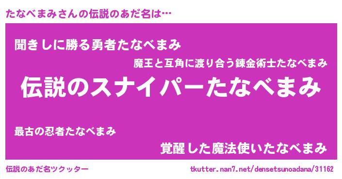 | 男性向けラノベタイトル風あだ名 | 『魔弾の王とたなべまみ』 |