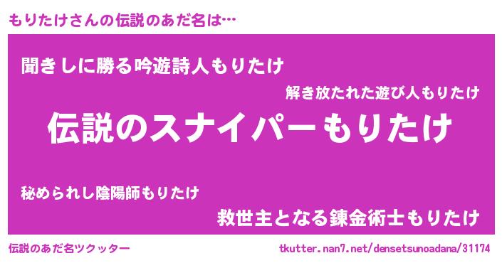 | 胡散臭い通販商品みたいなあだ名 | 『必ず成功する霊験あらたかなお札…その名も「もりたけ」』 |