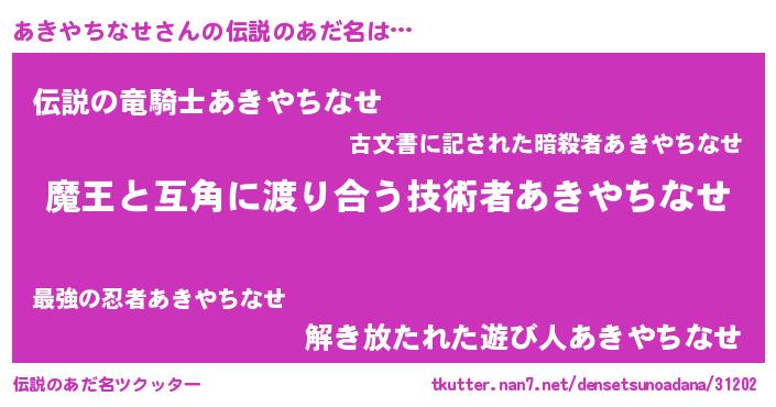 | 男性向けラノベタイトル風あだ名 | 『ノーゲーム・ノーアキヤチナセ』 |