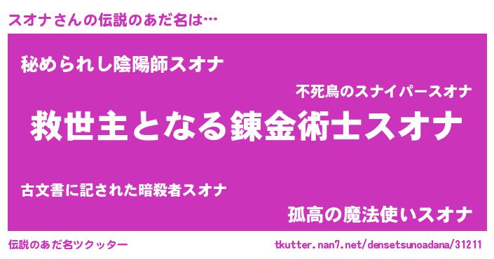 | 女子向けラノベタイトル風あだ名 | 『死神スオナの再婚』『スオナ様がみてる』 |
