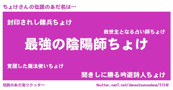 | 男性向けラノベタイトル風あだ名 | 『ちょけに滅ぼされるだけの簡単なお仕事です』 |