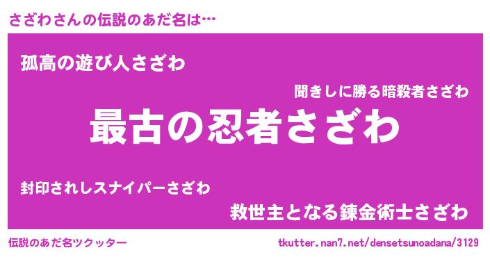 | 男性向けラノベタイトル風あだ名 | 『魔弾の王とさざわ』『サザワスレイヤー』 |