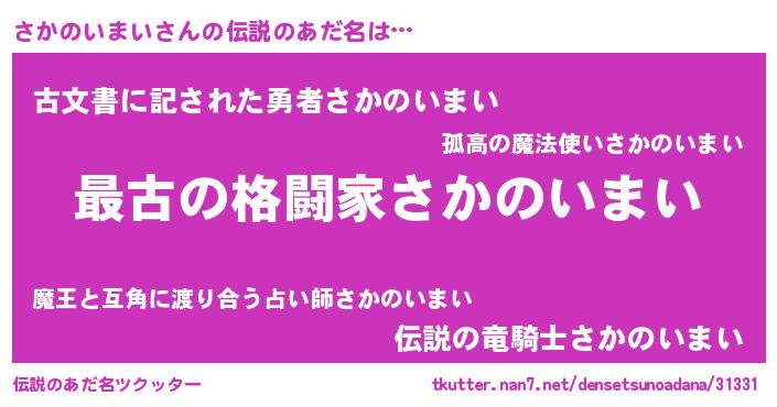| 男性向けラノベタイトル風あだ名 | 『転生したらさかのいまいだった件』 |