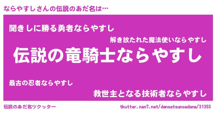 | ヒーロー風カッコイイあだ名 | 『スーパーナラヤスシ』『仮面ナラダー』 |