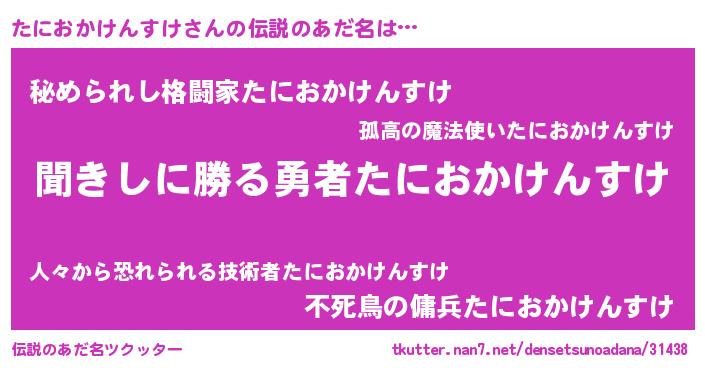 | ヒーロー風カッコイイあだ名 | 『ネオタニオカケンスケ』『黄金騎士タニ』 |