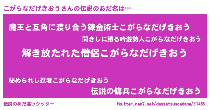 | 女子向けラノベタイトル風あだ名 | 『こがらなだげきおうの卵を拾いまして』 |