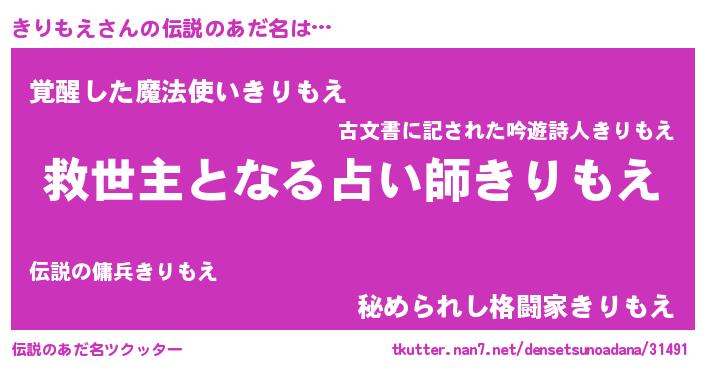 | ヒーロー風カッコイイあだ名 | 『慈愛の使者きりもえ』『天弓騎士キリ』 |