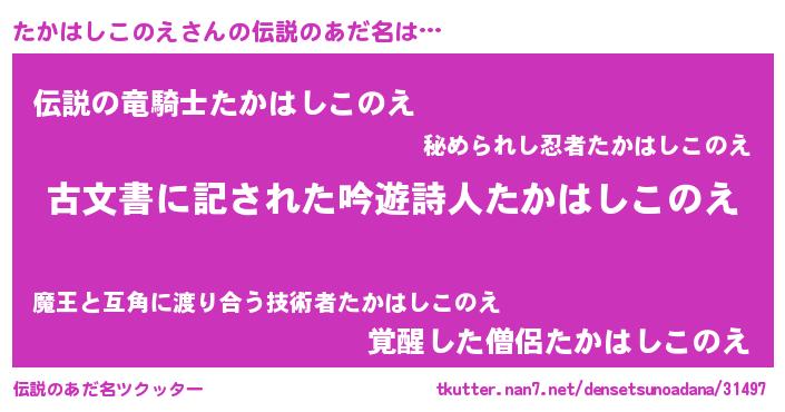 | ヒーロー風カッコイイあだ名 | 『ネオタカハシコノエ』『魔戒騎士タカ』 |