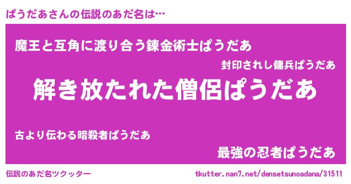 | ヒーロー風カッコイイあだ名 | 『魔戒騎士パウ』『正義の使者ぱうだあ』 |