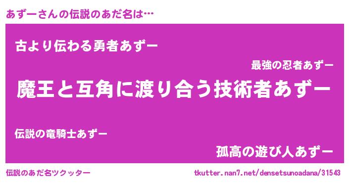| 男性向けラノベタイトル風あだ名 | 『おまえをオタクにしてやるから、俺をあずーにしてくれ! 』 |