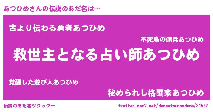 | 女子向けラノベタイトル風あだ名 | 『死神あつひめの再婚』 |