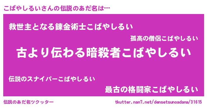 | 胡散臭い通販商品みたいなあだ名 | 『来世でも幸せになれる健康食品…その名も「こばやしるい」』 |