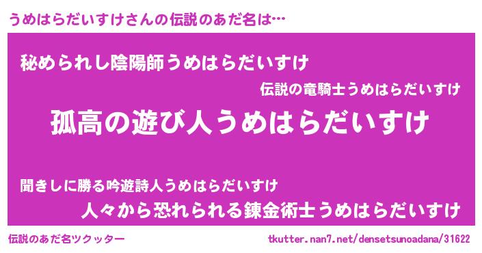 | 男性向けラノベタイトル風あだ名 | 『ダンジョンにうめはらだいすけを求めるのは間違っているだろうか』 |