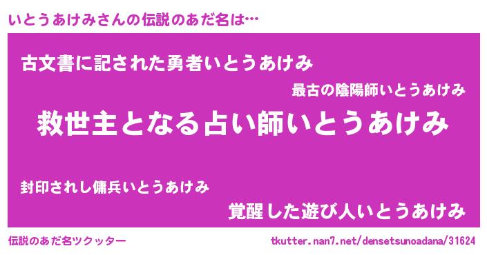 | 男性向けラノベタイトル風あだ名 | 『ノーゲーム・ノーイトウアケミ』 |