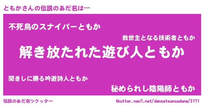 | ヒーロー風カッコイイあだ名 | 『魔戒騎士トモ』『サイバー戦士トモカ』 |