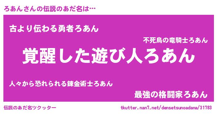 | 男性向けラノベタイトル風あだ名 | 『ろあんの嫁は女の子じゃないと思った?』 |