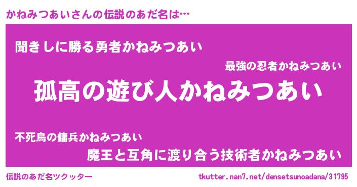 | 意味不明あだ名 | 『とにかく怪しいかねみつあい』 |