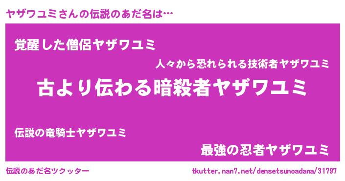 | ヒーロー風カッコイイあだ名 | 『ネオヤザワユミ』『炎刃騎士ヤザ』 |