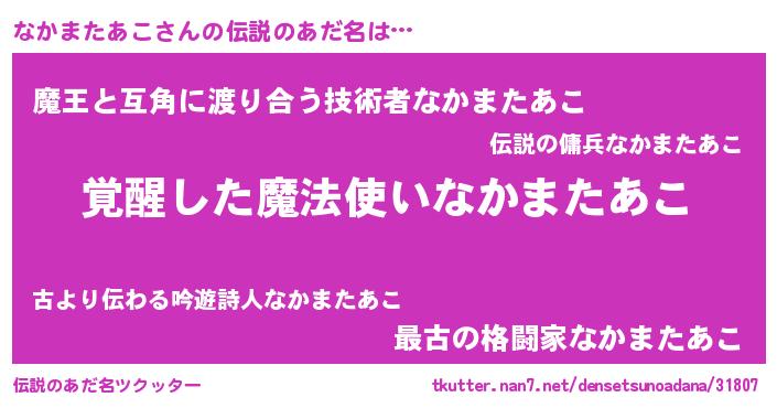 | ヒーロー風カッコイイあだ名 | 『究極戦士ナカマタアコ』『魔戒騎士ナカ』 |