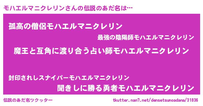 | 男性向けラノベタイトル風あだ名 | 『魔弾の王とモハエルマニクレリン』 |