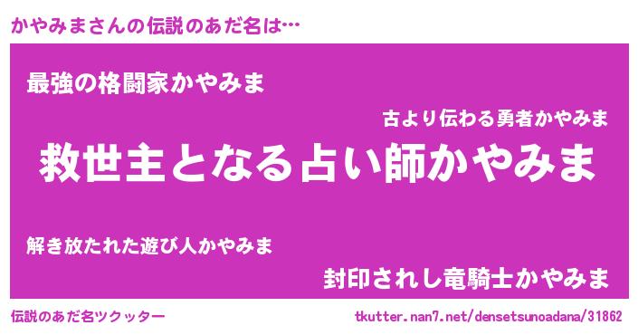 | ヒーロー風カッコイイあだ名 | 『慈愛の使者かやみま』『仮面カヤダー』 |