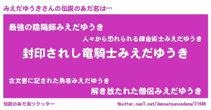 | ヒーロー風カッコイイあだ名 | 『スーパーミエダユウキ』『炎刃騎士ミエ』 |