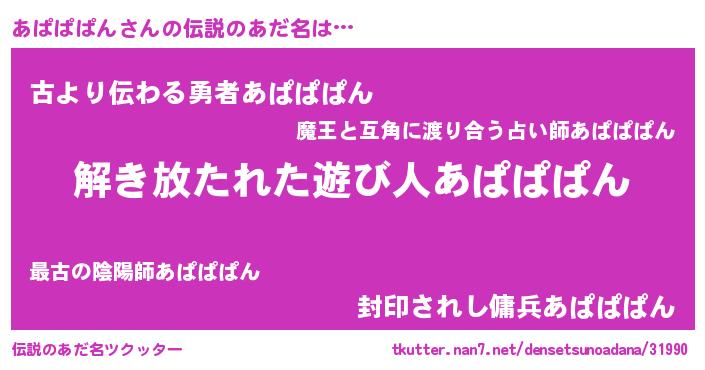 | ヒーロー風カッコイイあだ名 | 『銀牙騎士アパ』『ネオアパパパン』 |