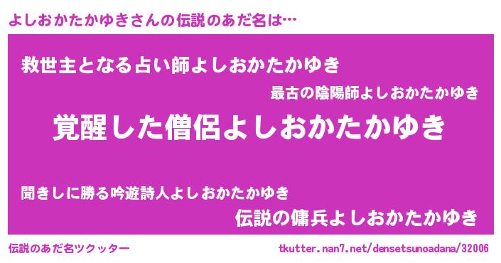 | 男性向けラノベタイトル風あだ名 | 『よしおかたかゆき~年齢イコール彼女いない歴の魔法使い~』 |