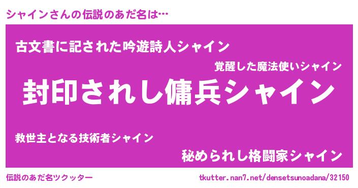 | 男性向けラノベタイトル風あだ名 | 『シャインに滅ぼされるだけの簡単なお仕事です』 |
