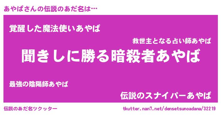 | 男性向けラノベタイトル風あだ名 | 『アヤバスレイヤー』 |