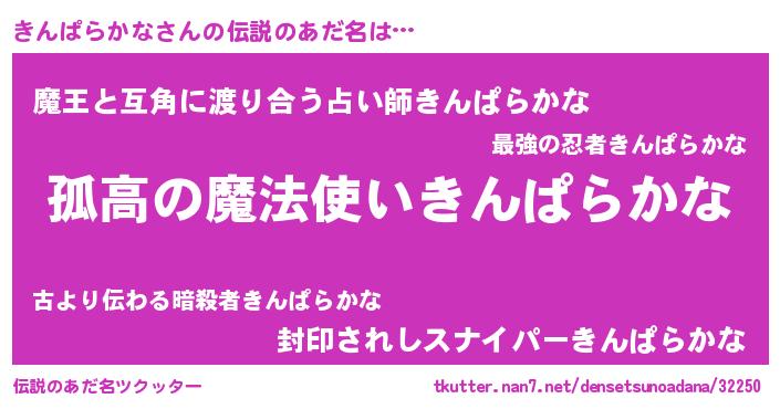 | 胡散臭い通販商品みたいなあだ名 | 『信頼と実績のサプリメント…その名も「きんぱらかな」』 |