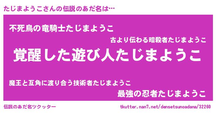 | 男性向けラノベタイトル風あだ名 | 『たじまようこ~年齢イコール彼女いない歴の魔法使い~』 |