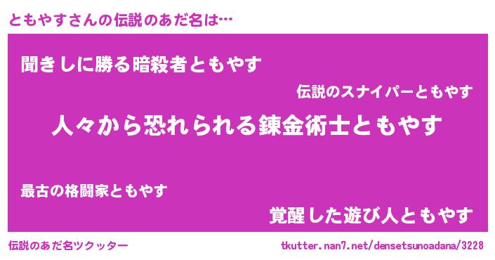 | 意味不明あだ名 | 『住所不定無職ともやす(89歳)』 |