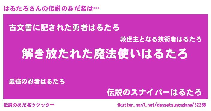 | 男性向けラノベタイトル風あだ名 | 『はるたろの嫁は女の子じゃないと思った?』 |