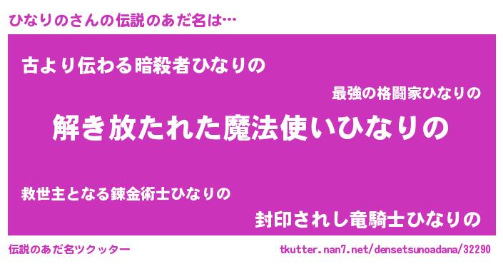 | 男性向けラノベタイトル風あだ名 | 『ひなりのの嫁は女の子じゃないと思った?』 |