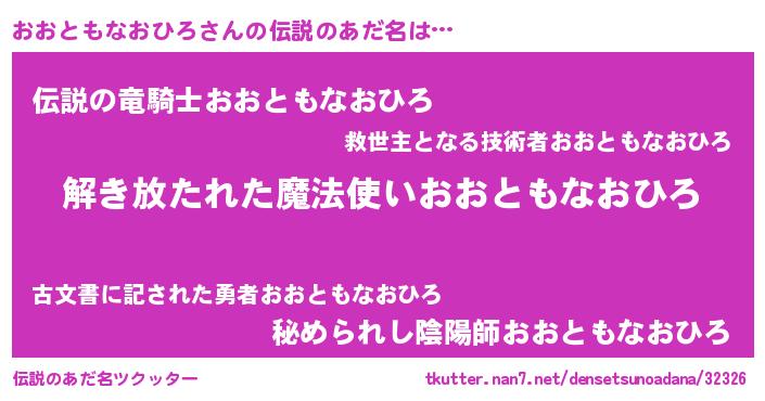 | 男性向けラノベタイトル風あだ名 | 『魔弾の王とおおともなおひろ』 |