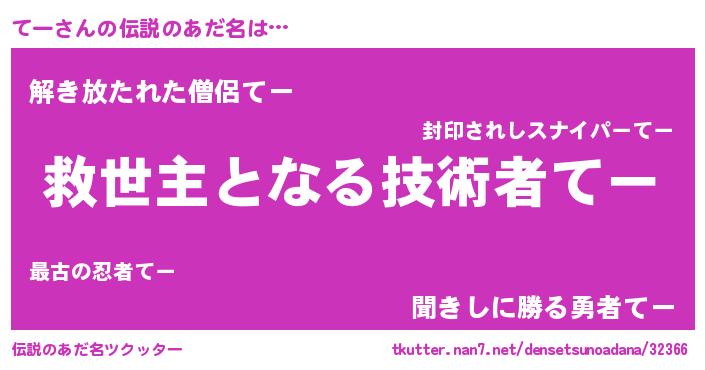 | 男性向けラノベタイトル風あだ名 | 『てー~年齢イコール彼女いない歴の魔法使い~』 |
