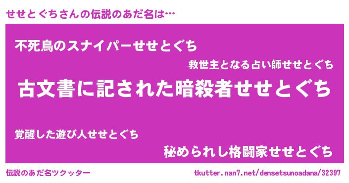| 女子向けラノベタイトル風あだ名 | 『せせとぐちストレイドッグス』 |