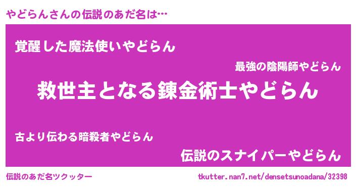 | ヒーロー風カッコイイあだ名 | 『慈愛の使者やどらん』『黄金騎士ヤド』 |