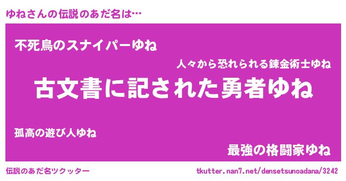 | 男性向けラノベタイトル風あだ名 | 『ゆね~年齢イコール彼女いない歴の魔法使い~』 |