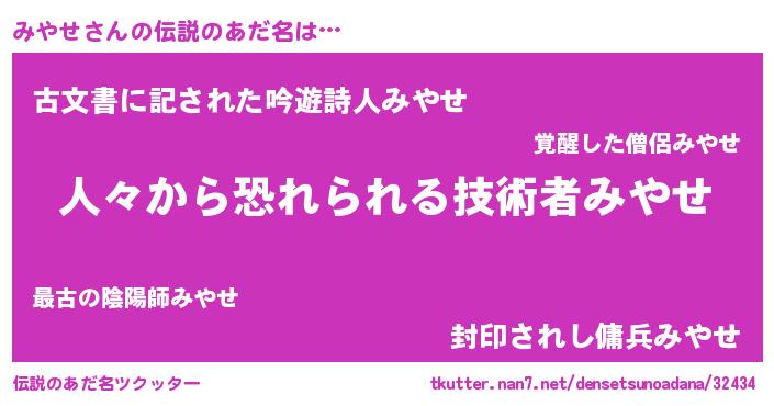 | 意味不明あだ名 | 『住所不定無職みやせ(7歳)』『自称みやせ』 |