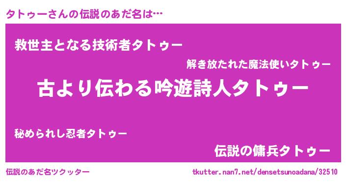 | ヒーロー風カッコイイあだ名 | 『サイバー戦士タトゥー』『ネオタトゥー』 |