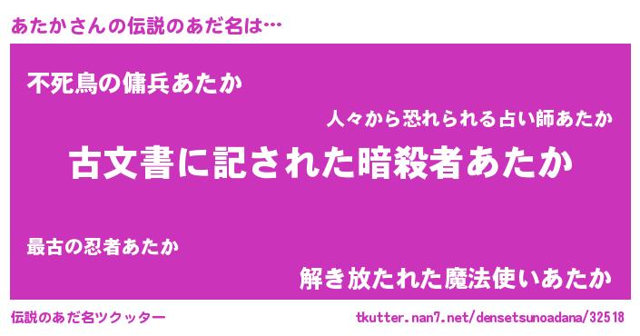 | 男性向けラノベタイトル風あだ名 | 『あたかに滅ぼされるだけの簡単なお仕事です』 |