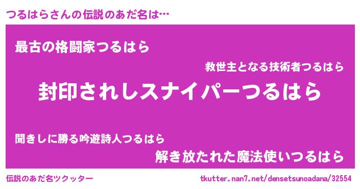 | 男性向けラノベタイトル風あだ名 | 『つるはら~年齢イコール彼女いない歴の魔法使い~』 |