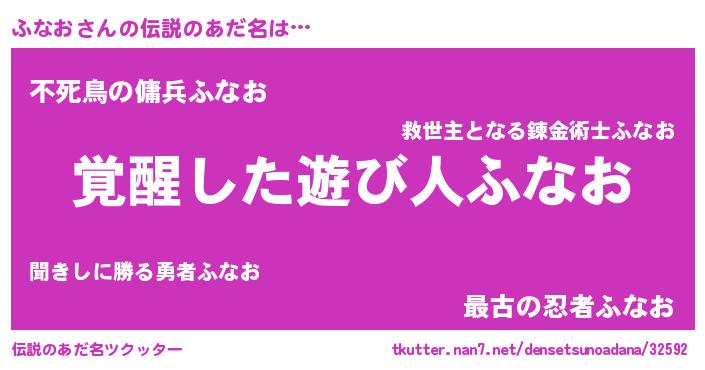 | 男性向けラノベタイトル風あだ名 | 『ふなおの嫁は女の子じゃないと思った?』 |