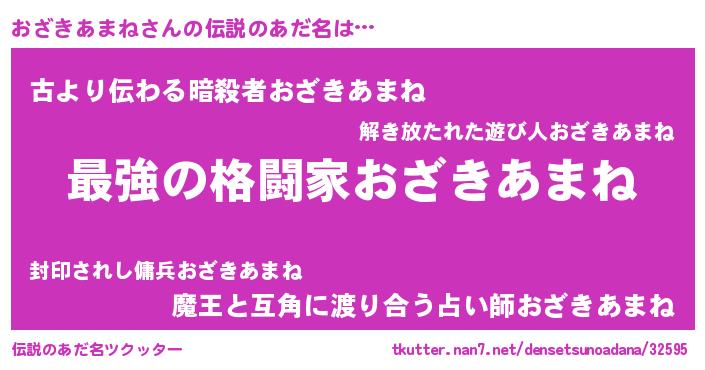 | 男性向けラノベタイトル風あだ名 | 『おざきあまね~年齢イコール彼女いない歴の魔法使い~』 |