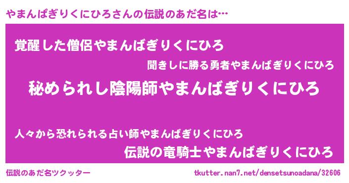 | 男性向けラノベタイトル風あだ名 | 『やはりやまんばぎりくにひろの青春ラブコメはまちがっている 』 |