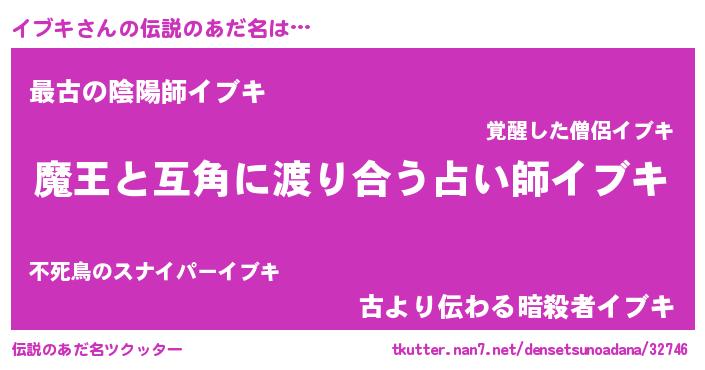 | 女子向けラノベタイトル風あだ名 | 『イブキ恋絵巻』『イブキの婚約者』 |
