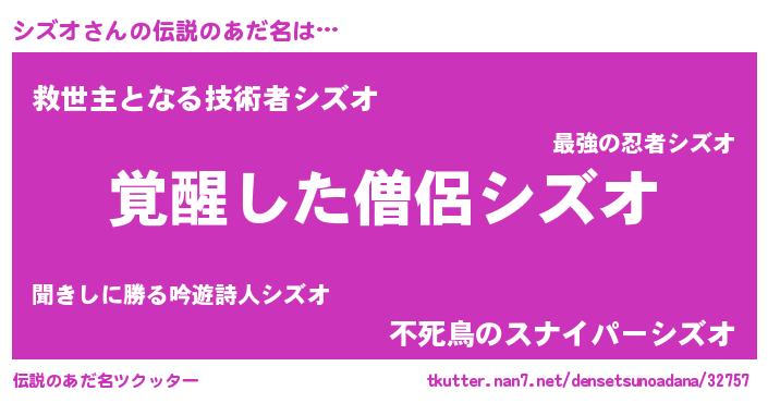 | ヒーロー風カッコイイあだ名 | 『天弓騎士シズ』『究極戦士シズオ』 |