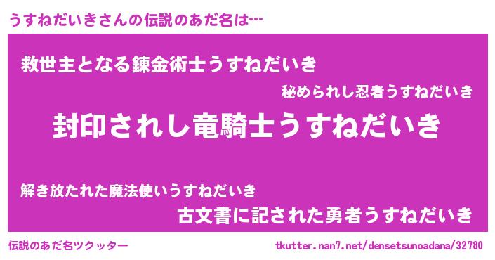| 男性向けラノベタイトル風あだ名 | 『うすねだいきに滅ぼされるだけの簡単なお仕事です』 |